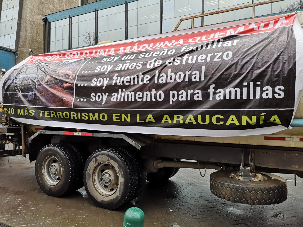 Durante la manifestación exhibieron por el centro de la ciudad, sus camiones y maquinaria incendiadas tras diversos atentados sufridos.