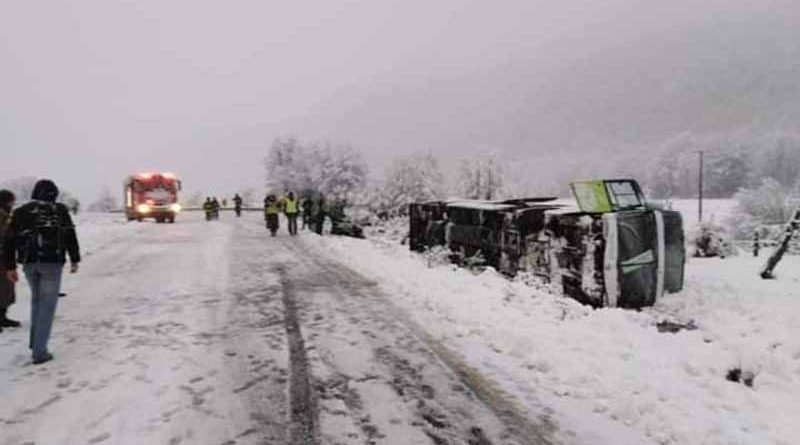 Tras las constantes nevazones durante los últimos días, se produce un accidente de tránsito, que involucra el volcamiento de un bus.