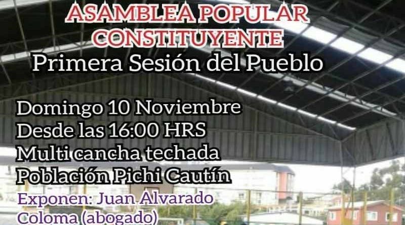 El próximo domingo 10 de noviembre, desde las 16 horas, en la Multicancha del sector Pichi Cautín (una de las poblaciones emblemáticas de Temuko) se realizará la 1° Sesión Asamblea Popular y Poblacional Constituyente. En esta actividad participarán los siguientes exponentes, entre ellos, Carlos del Valle, Doctor en Comunicación, profesor titular UFRO; Juan Ricardo Alvarado Coloma, Abogado laboral; Matías Arévalo, estudiante de derecho y poblador, además de dirigentes sociales y vecinos del sector. En dicho encuentro se plantearán temas como salud, vivienda, trabajo, previsión, y la conculcación de los derechos sociales, culturales, ambientales y económicos de la población chilena, temas necesarios a discutir, en el contexto coyuntural.