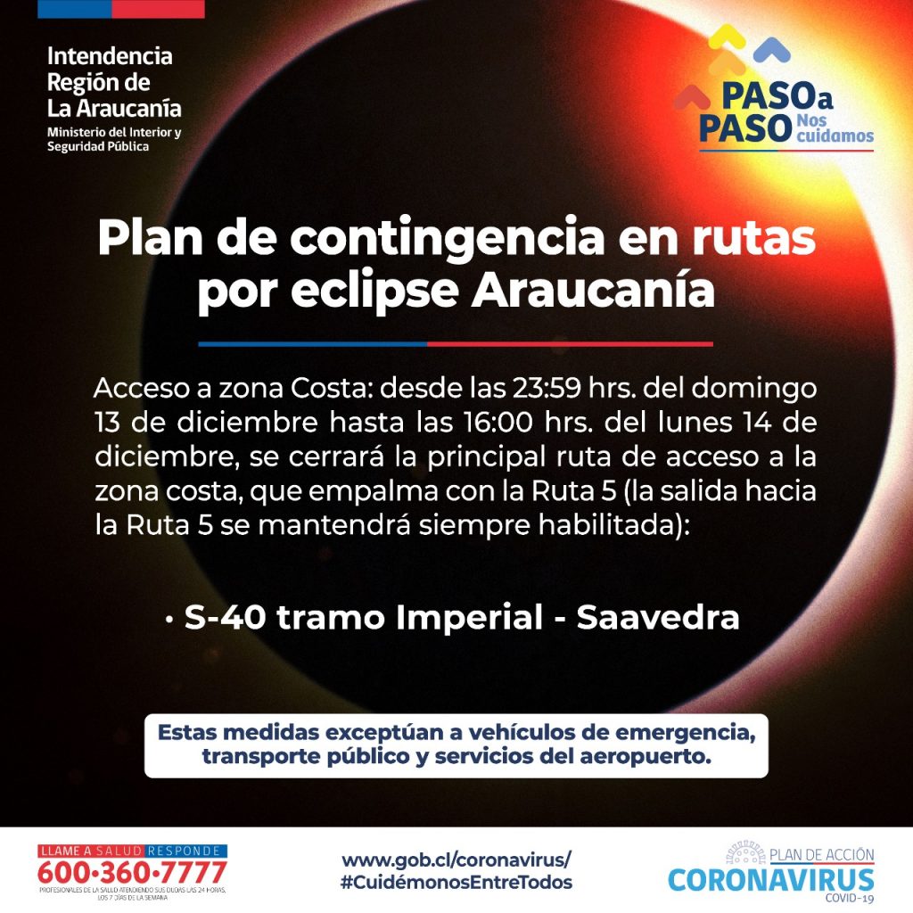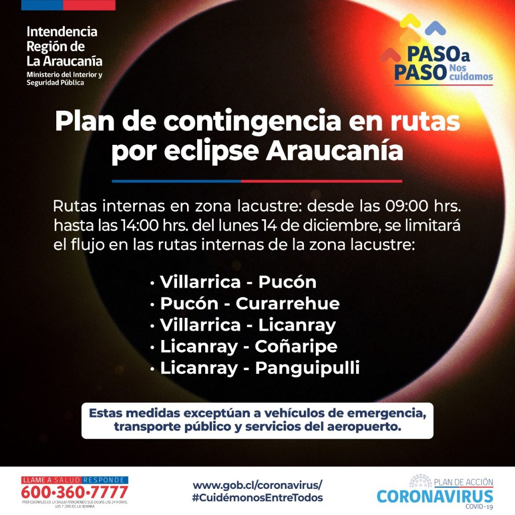Dentro del plan de contingencia por el eclipse en La Araucanía y dentro del eje Infraestructura Transporte y Abastecimiento generado producto de este importante evento, “se efectuarán cierres en las siguientes rutas que comenzarán a las 23.59 de este domingo 13 de diciembre y finalizarán a las 16 horas del lunes 14 de diciembre como en la Ruta CH199 en el tramo Freire – Villarrica, empalme Ruta 5/Freire y cruce Allipén/Villarrica. Además de la Ruta S-65, en el tramo Pitrufquén – Ñancul y también en la vía S-91, en el tramo Villarrica-Loncoche, empalme Ruta 5/Loncoche. Medida que también se realizará en el acceso a la zona Costa en la Ruta S-40 tramo Nueva Imperial-Saavedra”.