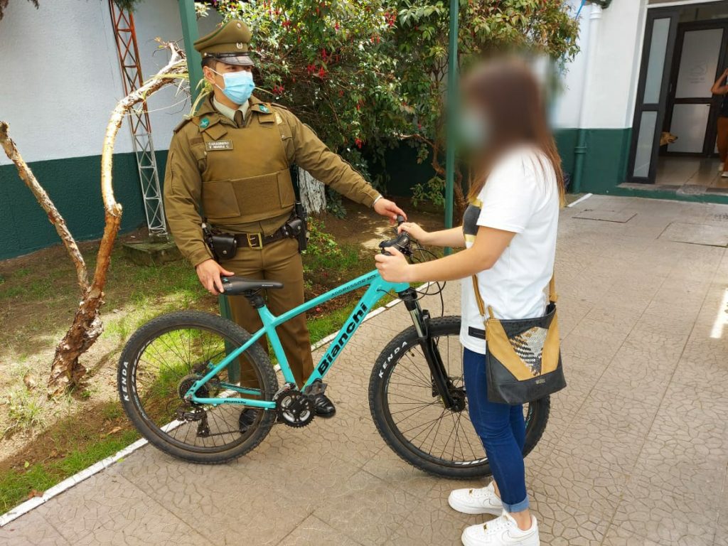 La víctima, una joven que había adquirido su bicicleta hace dos meses -avaluada en $400.000- para desplazarse hacia su trabajo y evitar la locomoción colectiva por la pandemia, recibió la buena noticia de parte de Carabineros.