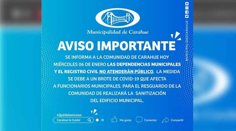 Por medio de un comunicado en la plataforma social de Facebook, el municipio dio a conocer esta medida por un brote de Covid-19 al interior del Municipio y de las oficinas del Registro Civil.