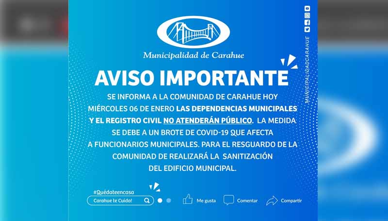 Brote de Covid-19 obligó a cerrar Municipio de Carahue durante la jornada de este miércoles
