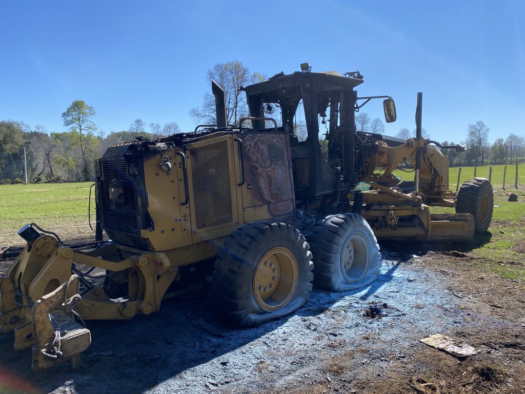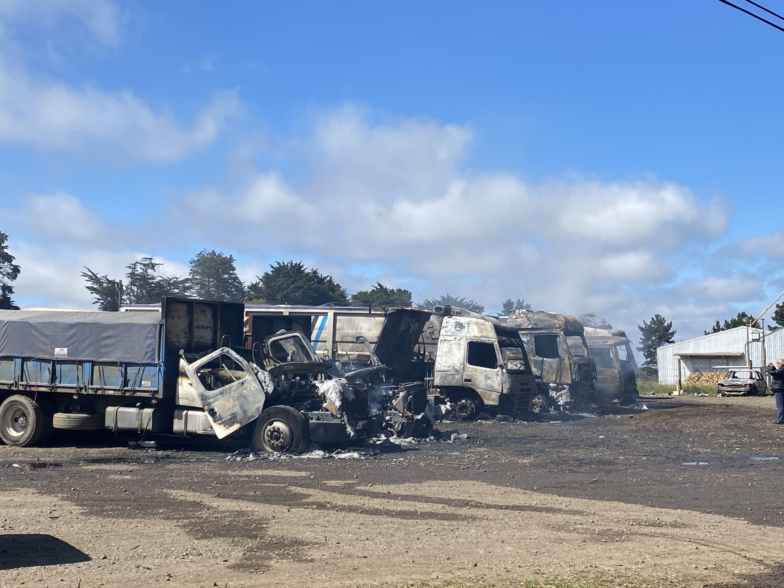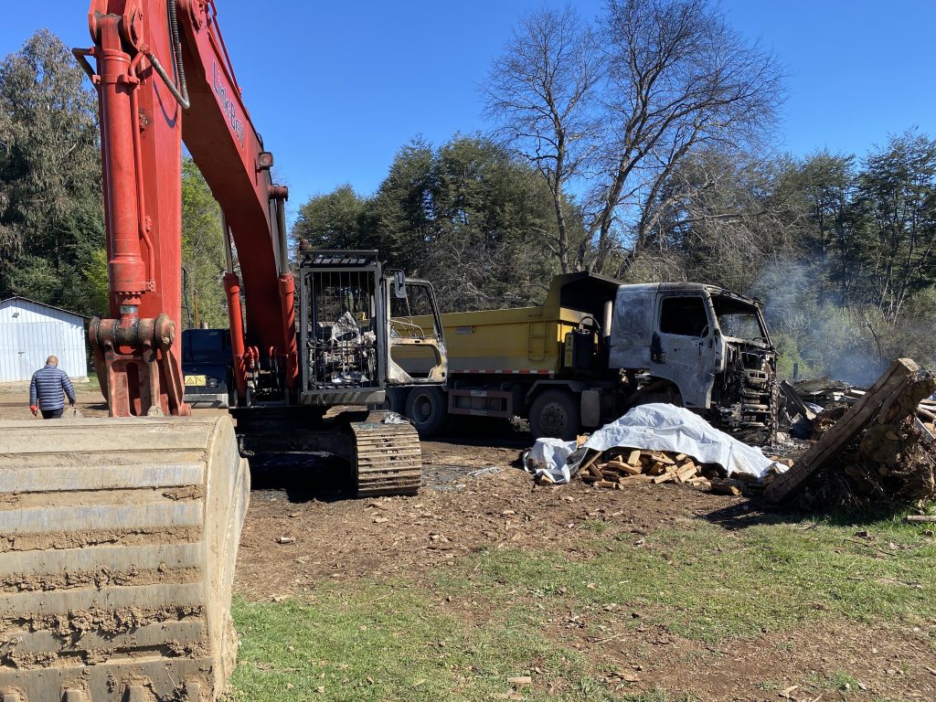Ataque incendiario en Inspector Fernández, donde sujetos prendieron fuego a un galpón, un rodillo, dos retro excavadoras y un camión tolva, donde además el propietario del lugar le dispararon a la altura de su hombro, dejándolo lesionado con impacto de perdigón.