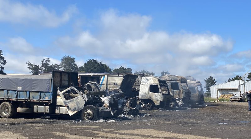 Encapuchados incendiaron 8 camiones y un vehículo particular a un costado de un centro de abastecimiento agrícola, a metros de la planta Carozzi en la comuna de Victoria.