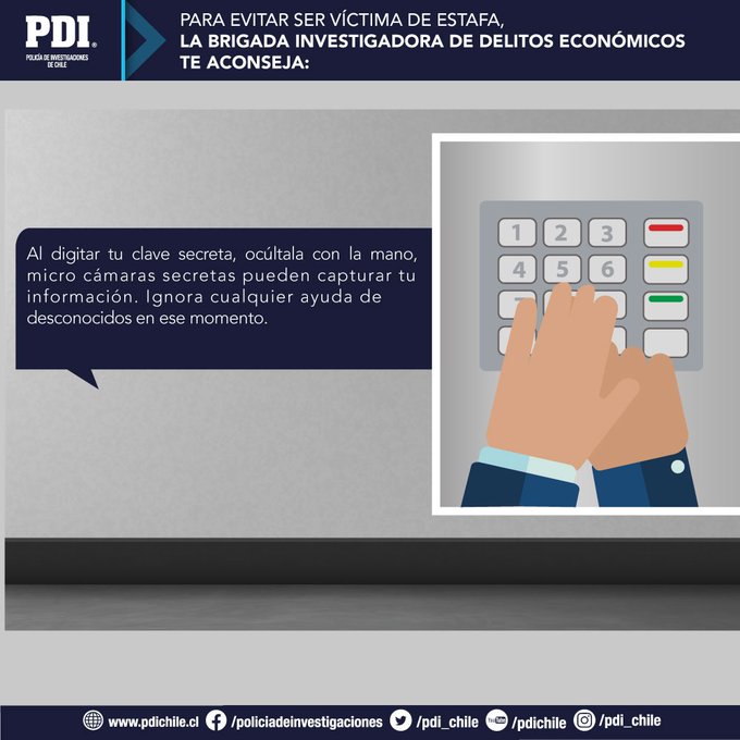 Al realizar transacciones con dinero en efectivo, el oficial destacó que se debe verificar la autenticidad de los billetes para no encontrarse con un billete falso. En cuanto a transacciones con tarjetas bancarias “es importante velar por la seguridad de sus claves y tarjetas, no perdiéndolas de vista y protegiendo sus claves al momento de digitarlas. Además, en caso de requerir girar dinero desde un cajero automático, ponga atención a cualquier elemento extraño y evite usarlo si presenta alguna alteración”, finalizó el jefe subrogante de la Bridec Temuco.