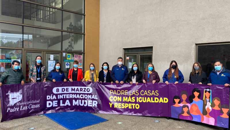 Y a pesar de la copiosa lluvia, la Muncipalidad de Padre Las Casas desplegó sus gráficas especializadas para conmemorar el Mes de la Mujer en la comuna, con lienzos alusivos a la igualdad y el respeto hacia las mujeres en el acceso en el puente Treng Treng Kay Kay, la biblioteca municipal Pablo Neruda, en pasarelas peatonales y en el edificio consistorial.