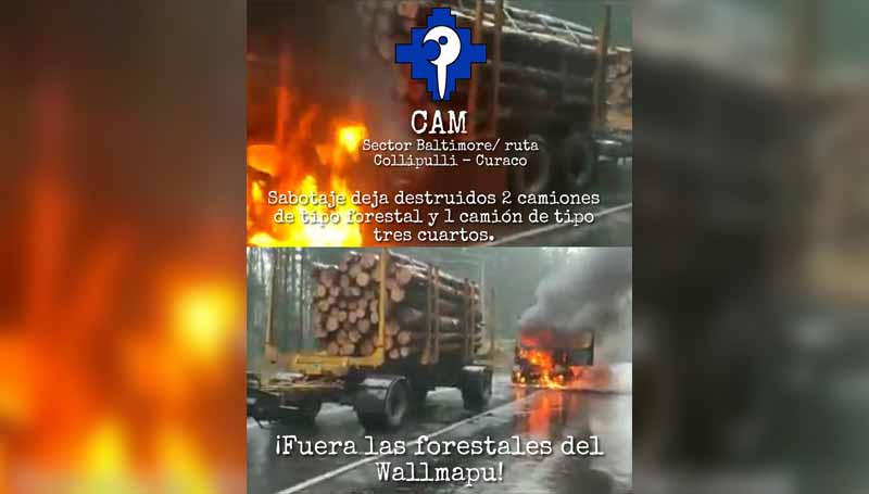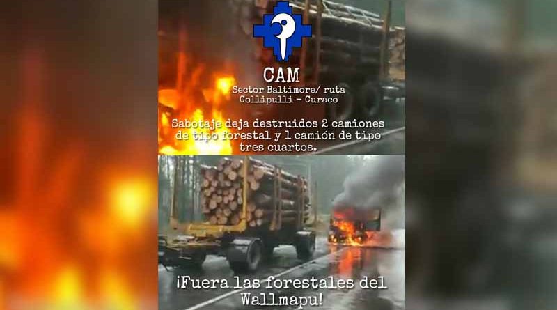 CAM se adjudica ataque incendiario a dos camiones forestales y uno tipo tres cuartos en la ruta #Collipulli #Curaco