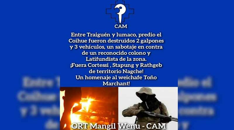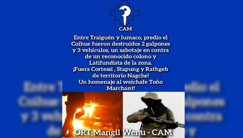 En el lugar a la altura del kilómetro 4, en el fundo El Coigüe, un grupo de encapuchados armados de la Coordinadora Arauco Malleco rociaron con combustible tres vehículos y un galpón, quedando destruidos por la acción del fuego.