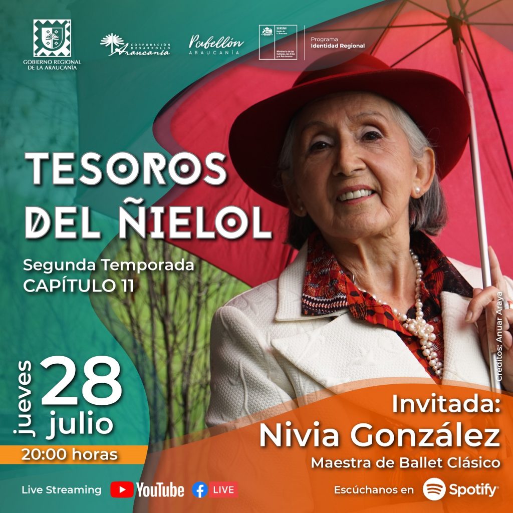 A las 20.00 horas de este jueves 28 de julio, en el episodio 11 de la segunda temporada de “Tesoros del Ñielol” la invitada será la maestra de danza Nivia González, quien cuenta con una trayectoria de 64 años de formación en ballet clásico, en la capital regional. Este ciclo de mediaciones artísticas es una iniciativa de la Seremi de las Culturas, las Artes y el Patrimonio mediante su programa de Fortalecimiento de la Identidad Cultural Regional coordinada en conjunto, a través de un convenio de colaboración, con la Corporación de Desarrollo Araucanía y el Pabellón Araucanía.