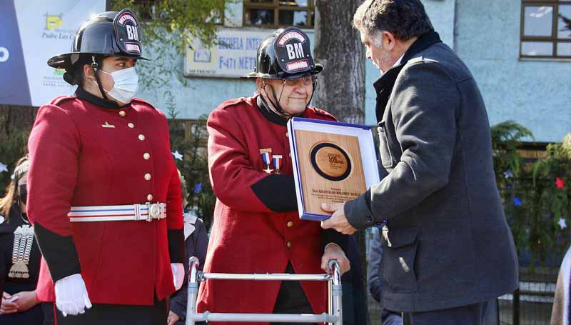 Durante el desfile oficial de Fiestas Patrias 2022, realizado este martes en Metrenco, la Municipalidad de Padre Las Casas entregó un reconocimiento especial al bombero honorario Archivaldo Bolomey Muñoz, de 87 años de edad, fundador de la Brigada de Bomberos de Metrenco, perteneciente al Cuerpo de Bomberos de Temuco.