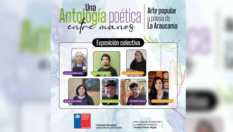 Financiado por el Ministerio de las Culturas, las Artes y el Patrimonio, Una Antología Poética Entre Manos, propone una reinterpretación alegórica que contribuye con la estética y el discurso de nuestro territorio y aporta reflexiones sobre la fusión de formas y contenidos y la creación artística contemporánea a partir de oficios tradicionales. Participan de la muestra los artistas artesanos Yessica Huenteman, Luz Ariela Coña, Jessica Huaiquiñir, Manuela Alchao, Tomás Cataldo, Franco Varas San Martín y Luis Castillo.