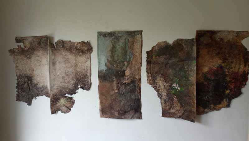 La primera serie, denominada “Intemperie”, corresponde a un grupo de pinturas expuestas por cinco años a la inclemencia del clima de nuestra Araucanía y que, en su estado actual, luego de este periodo de tiempo, nos invita a dialogar y reflexionar en torno a la fragilidad de la superficie desde la contemplación.