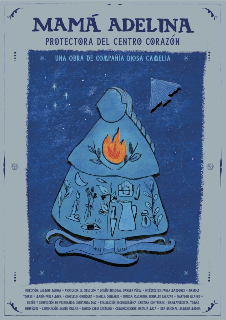 El elenco de la compañía Diosa Camelia, para la obra Mamá Adelina, está conformado por mujeres profesionales de las artes escénicas, Marioly Torres, Daniela González, María-Paula Mora, Paula Mardones y Consuelo Henríquez . En la música y composición están Macarena Bernales y Maryorie Illanes. Guiadas por  el equipo de Dirección compuesto por Daniela Pérez en la asistencia de dirección y Diseño Integral, y Jasmine Medina en la Dirección. El guión fue construido con el apoyo del dramaturgo, Tomas Henriquez.