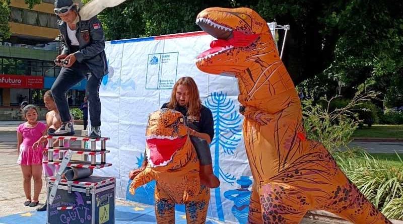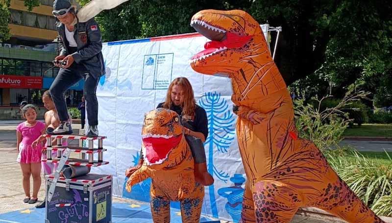 Payaso Solutto y Jurassicos mostraron en la Plaza Aníbal un adelanto de la presentación de este sábado y llamaron a niñas, niños y jóvenes a sumarse a esta actividad.