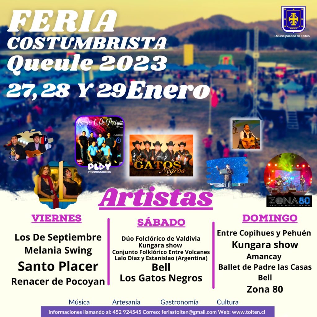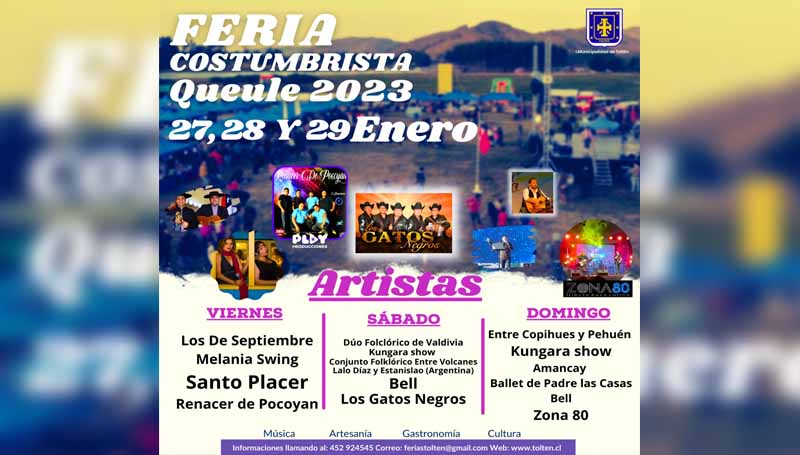 Tras un año suspendido a causa de la pandemia del Covid-19, este 27 de enero se dará inició a una nueva versión de la tradicional Feria Costumbrista de Queule. La celebración busca reunir a los comités campesinos, juntas de vecinos y otras comunidades de la zona durante esta temporada estival. El evento tendrá lugar en la cancha de carreras del Club del Huaso de Queule, comuna de Toltén, y abrirá sus puertas este viernes 27 de enero a las 12:00 AM, y el fin de semana a las 9:00 AM.