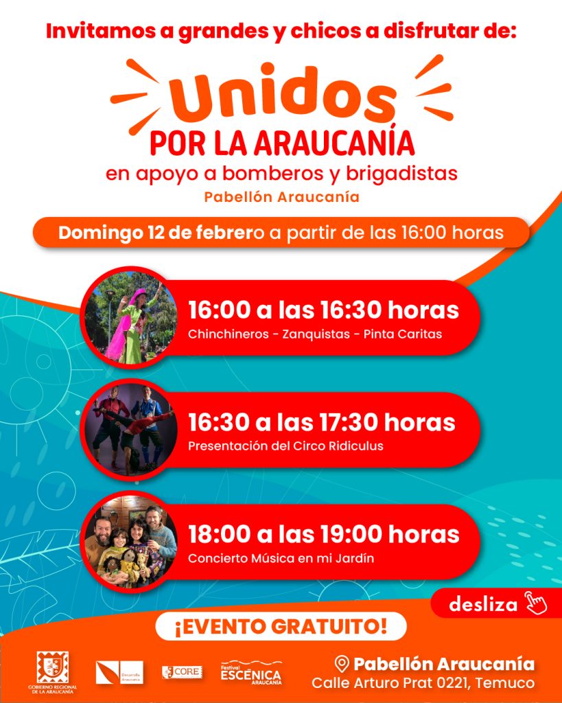 Para recaudar aportes que vayan en ayuda de bomberos y brigadistas, que hoy trabajan incansablemente por contener los incendios que afectan a varias comunas de la región, el Gobierno Regional de La Araucanía organizó un entretenido panorama familiar para este domingo 12 de febrero, a las 16 horas, denominado “Unidos por La Araucanía”.