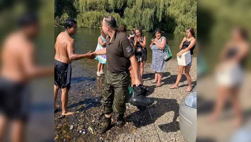 Sin dudarlo, el Cabo 2do. Sebastián Matus se arrojó al caudal y lo rescató con éxito, luego fue aplaudido por los bañistas que se encontraban allí.