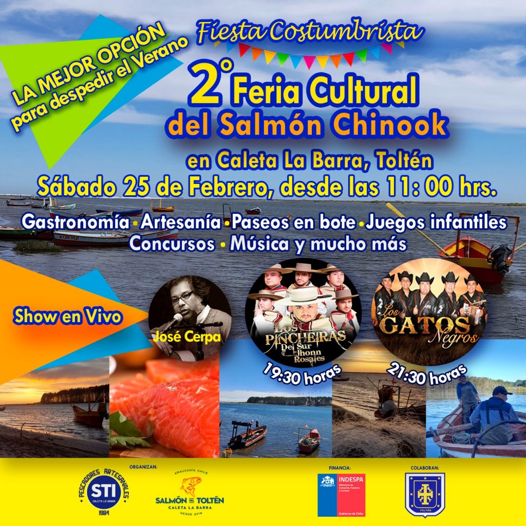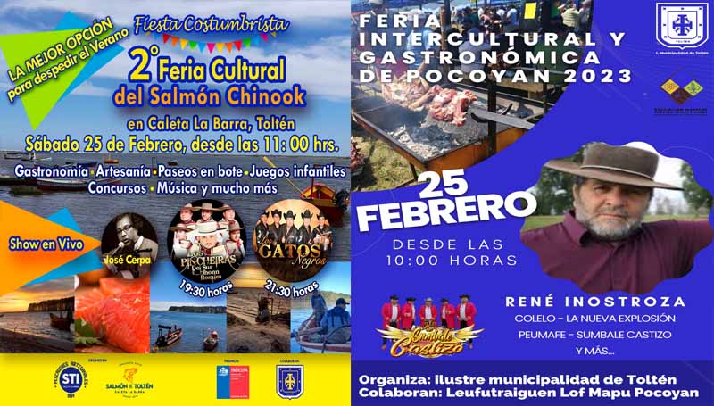 Desde las 10 de la mañana y durante todo el día esta feria de Pocoyan ofrecerá una gran alternativa para la comunidad y los visitantes para disfrutar de asados, cerveza artesanal y diversas actividades. Otra alternativa en la comuna de Toltén el sábado 25 es la segunda versión de la fiesta del Chinook, actividad que mostrará lo mejor de la gastronomía de caleta La Barra, desde las 11 horas en la cancha de fútbol del sector. Aquí se cuenta con la presentación de la agrupación ranchera Los Gatos Negros, Pincheras del Sur y la mejor degustación gastronómica a base de salmones Chinook.
