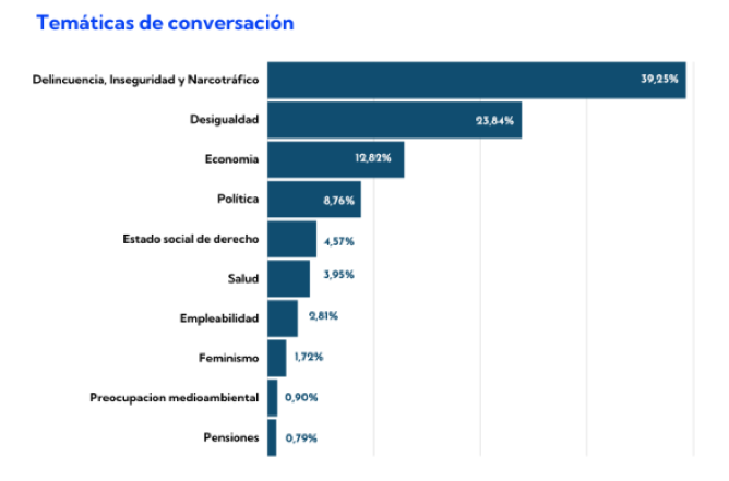 - Entre el 1 y el 19 de abril, el 39% de las conversaciones en redes sociales en torno al proceso tuvo como foco la delincuencia, la inseguridad y el narcotráfico.
