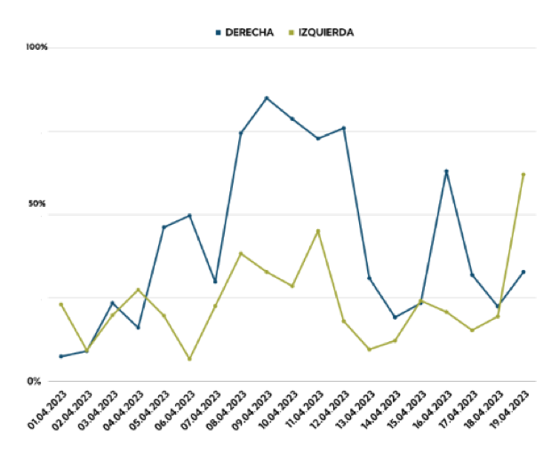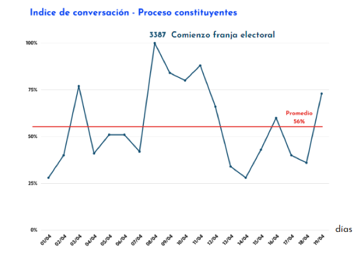 El índice de conversación que midió el estudio arrojó un peak de 3.387 conversaciones en torno al proceso constituyente el 8 de abril, día posterior al inicio de la franja electoral. El 19 de abril dicho índice, con base 100 en el día con más conversaciones, es decir, el 8 de abril, se encontraba en un 73%.