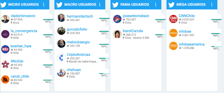 Entre los fama usuarios más influyentes están el líder del Partido Republicano, José Antonio Kast y la diputada del Partido Comunista, Karol Cariola. Mientras que en los mega usuarios más influyentes están la cuenta oficial de CNN Chile y la del portal de noticias Infobae.