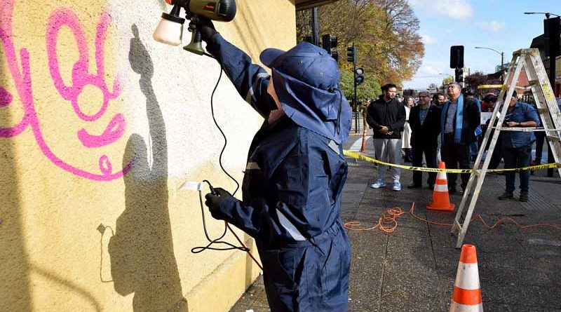 En la esquina de calle Prat con Lautaro, el alcalde de Temuco, Roberto Neira dio el vamos al programa de “Limpieza de Fachadas” en el marco del programa Revive Temuco, proyecto que permitirá intervenir edificaciones públicas y privadas, eliminando los rayados y grafitis del casco central de la capital regional.