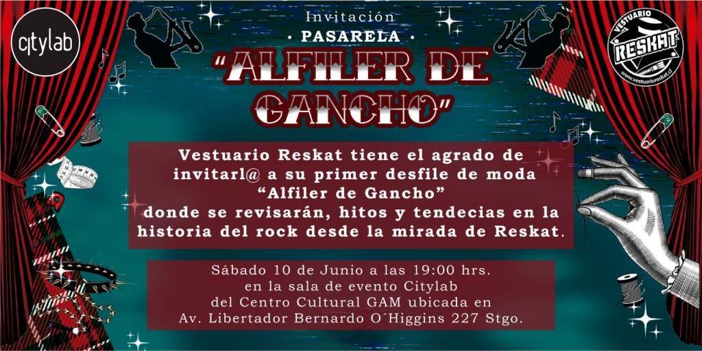 En esta ocasión Reskat tiene el agrado de presentar sus últimas dos dos colecciones (“Colección Ramonera, 2022” “Reskate–Reskata, 2023”) de chaquetas y accesorios entre otros atuendos, los que serán exhibidos, a través de una pasarela performática llamada “Alfiler de Gancho” en la que desfilarán en forma cronológica los hitos y tendencias de la historia del rock desde los años 50 hasta la actualidad, complementando con música en vivo, danza, performance, regalos, cupones de descuento y algunas sorpresas.