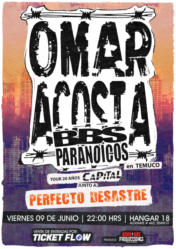 Omar Acosta, reconocido artista y vocalista oficial del icónico disco “Capital” de BBS Paranoicos, se complace en anunciar su próxima gira por el sur de Chile. Después de una serie de exitosas presentaciones en el norte del país, Omar se embarcará en una serie de conciertos con banda completa para conmemorar el vigésimo aniversario de este influyente álbum.