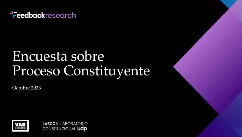 Metodología: El estudio de campo fue realizado por Feedback Research, entre los días 24 y 26 de octubre de 2023, mediante encuestas online en una plataforma digital propia, a través de la cual se consultó a 5086 personas. La muestra es de carácter no probabilística, según cuotas por macrozonas (que abarcó un total de 16 regiones del país), género y grupos de edad. Incluyó a hombres y mujeres mayores de 18 años, pertenecientes a niveles socioeconómicos medio-alto, medio y medio-bajo.