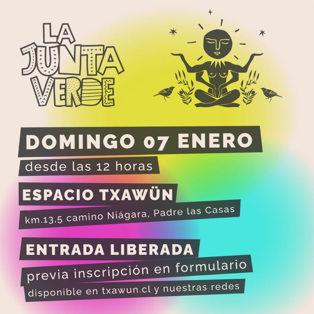 El evento familiar La Junta Verde promete música en vivo, danza, circo, teatro, cuentacuentos, talleres, feria de artesanos y de comidas en dos hectáreas de campo y bosque nativo. Está fijada para el domingo 7 de enero desde las 12 horas en el km 13.5 camino a Niágara, Padre Las Casas, la entrada es liberada previa inscripción en www.txawun.cl. Esta iniciativa cuenta con el financiamiento del Ministerio de las Culturas,las Artes y el Patrimonio a través de su Programa de Apoyo a Organizaciones Culturales Colaboradoras y la Convocatoria Pública de Apoyo para articulación territorial y puesta en valor de la economía creativa 2023 del Ministerio.