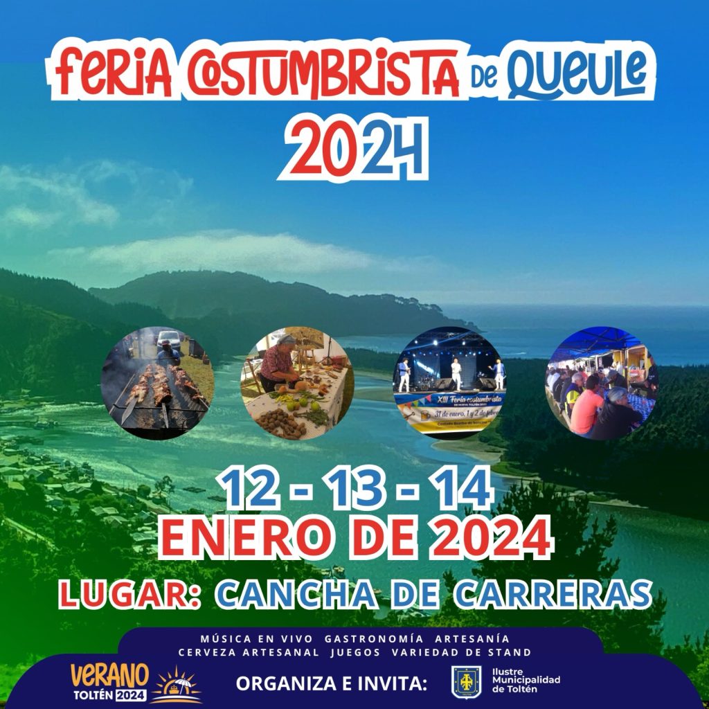 Desde este vienes 12 al domingo 14 de enero, se realiza en Caleta Queule Comuna de Toltén, una nueva versión de la Feria Costumbrista de esta caleta de pescadores artesanales, actividad organizada por el Municipio de Toltén. Este encuentro de tradiciones destaca por sus stand de gastronomías típicas, basada en productos frescos extraídos del mar, diversidad de degustaciones, muestra de licores artesanales, productos agro elaborados y presentación de diversos artistas durante las tres jornadas.