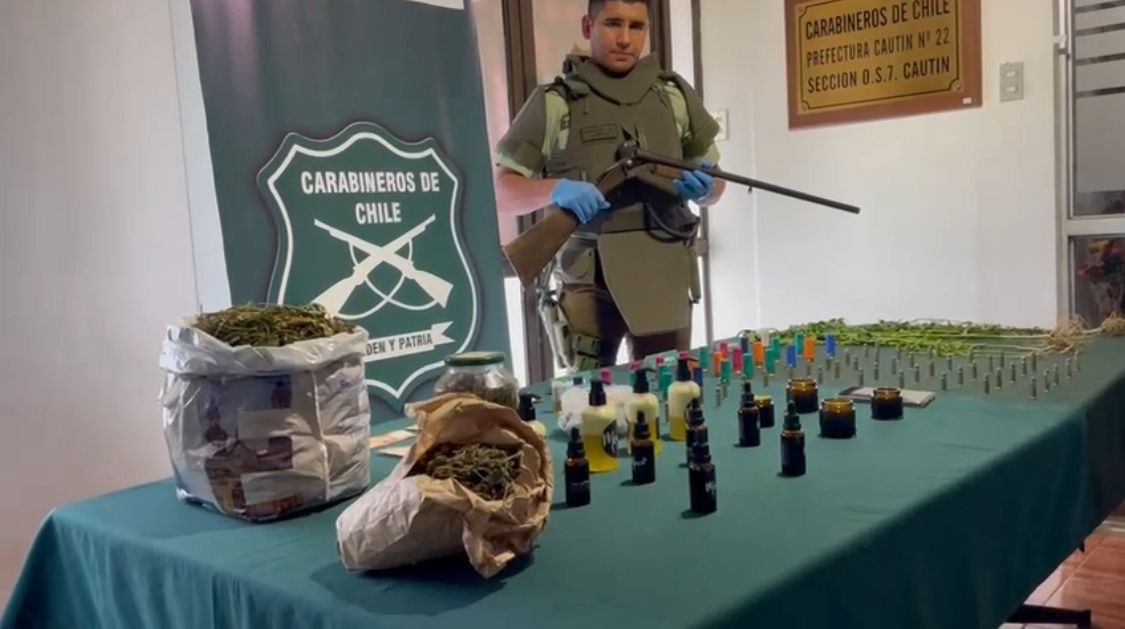 En los domicilios allanados tanto en Gorbea como en la comuna de Colina (Región Metropolitana) se incautaron alrededor de 3 kilos de Marihuana elaborada, 186 gramos de Clorhidrato de Cocaína, 48 gramos de hongos alucinógenos, 1 Kilo 761 gramos de productos con base de cannabis sativa consistentes en aceites, cremas y Shampoo, 5 teléfonos celulares y armamento consistente en una escopeta no inscrita y munición correspondiente a 28 cartuchos 12 mm y 48 de calibre 38.