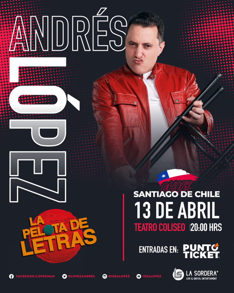 El destacado comediante, conductor y director, Andrés López llega a Chile con el “López Tour 2024”, una celebración que conmemora los 20 años de la icónica comedia “La pelota de letras”. El comediante celebrará y hará reír el próximo 13 de abril en Teatro Coliseo a las 20:00 hrs. Entradas por PuntoTicket.