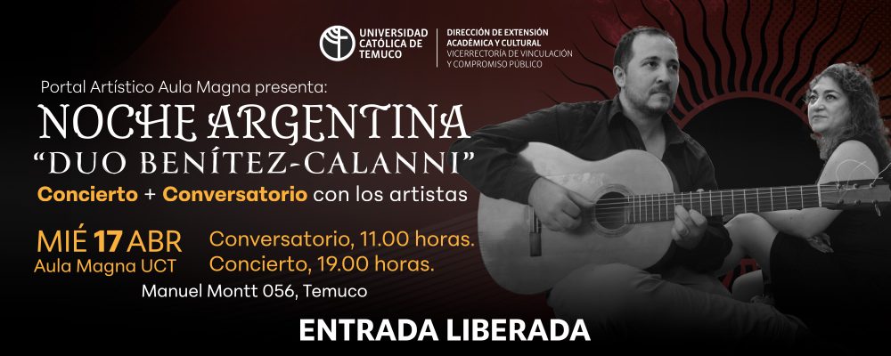 El concierto “Noche Argentina”, evento a cargo de la Dirección de Extensión Académica y Cultural de la UCT, es con entrada liberada hasta llenar los asientos. “Estamos muy contentos con la invitación de la universidad. Es un placer para nosotros, poder estar ahí con nuestro cancionero argentino y americano. Esperemos que haya mucha gente para compartirla por ahora”, sentenció.