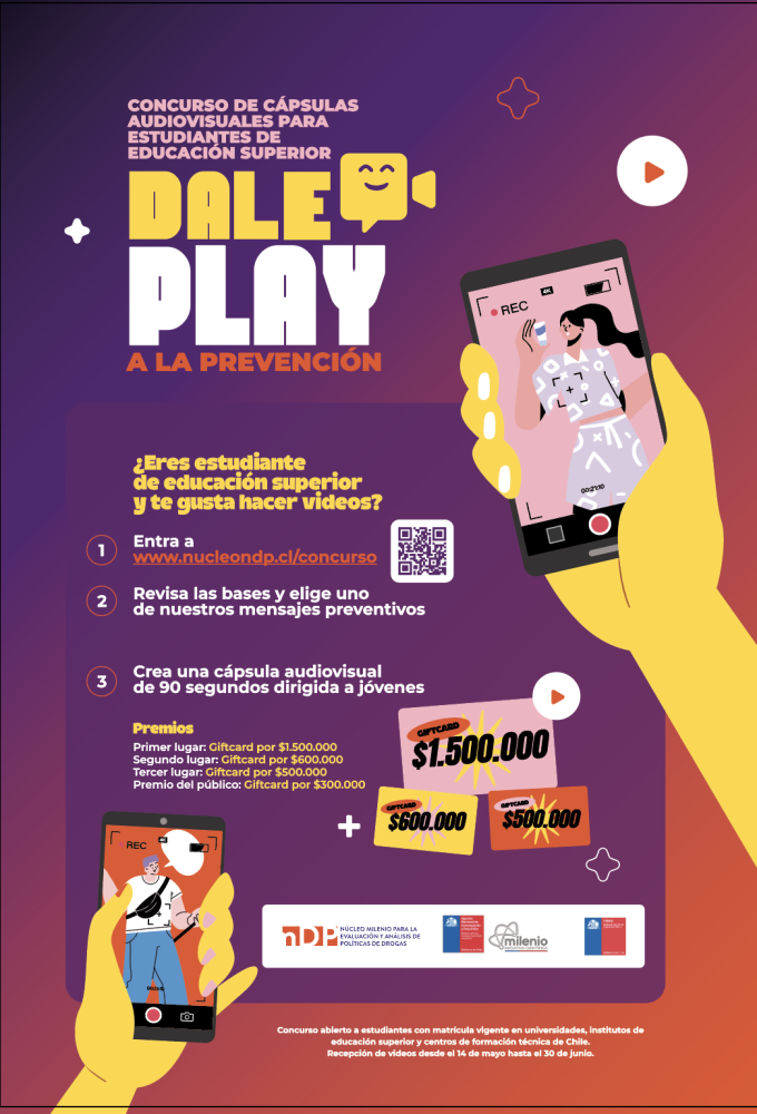 “Dale Play a la Prevención”. Este es el nombre del concurso organizado por el Núcleo Milenio para la Evaluación y Análisis de Políticas de Drogas (nDP), que busca motivar a estudiantes de la educación superior a crear cápsulas audiovisuales de prevención del consumo de alcohol y otras drogas.