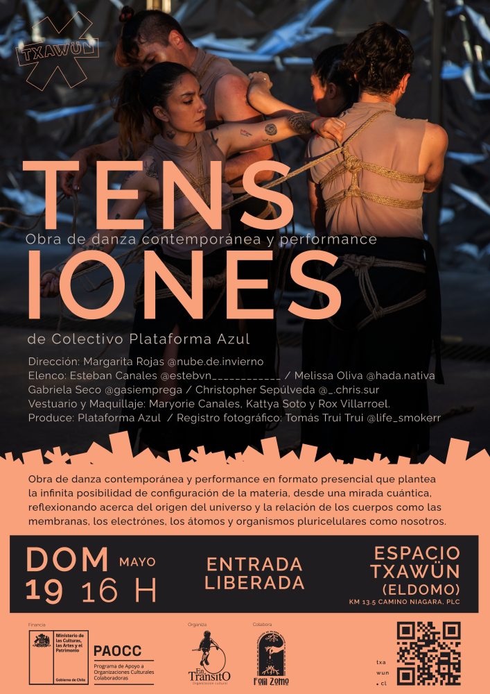 Una reflexión sobre el origen del universo, las relaciones entre electrones, átomos y organismos pluricelulares y sus similitudes con las formas de relacionarse de los seres humanos, son los ejes que propone la obra de danza contemporánea y performance TENS IONES que este domingo 19 de mayo, a las 16 horas, tendrá una función única en el Espacio de creación escénica Txawün, ubicado en el km 13,5 camino a Niágara Padre Las Casas.