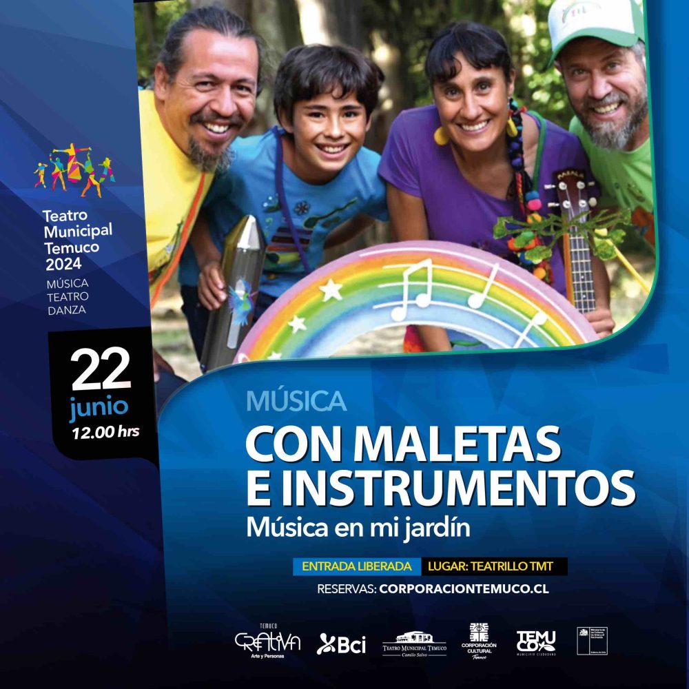 A continuación, a las 12:00 horas, la banda regional “Música en mi Jardín” ofrecerá su aclamado concierto “Con maletas e instrumentos”. Nacida en plena pandemia de 2020 en Curacautín, Región de La Araucanía, esta banda ha recorrido importantes escenarios de la región y del país, llevando entretenimiento y contenido de calidad a niñas y niños. Este espectáculo es un fascinante viaje musical que aborda las temáticas e inquietudes de la niñez actual mediante canciones, textos, juegos y dinámicas. Cada presentación es una puerta a la imaginación, explorando reflexiones, sensaciones, paisajes, naturaleza, territorio, curiosidad, salud, diversidad y ancestros en un ambiente lleno de alegría y aprendizaje. El concierto se estructura como un viaje por los conceptos básicos de la música: ritmo, melodía y armonía, representados como estaciones de tren. Además, se abordan temas como la libertad de expresión, la diversidad, el respeto por la naturaleza, el territorio, el patrimonio y el cuidado de la salud dental. Al finalizar, los niños y niñas podrán interactuar con los intérpretes, comentar la obra y conocer de cerca los instrumentos musicales.