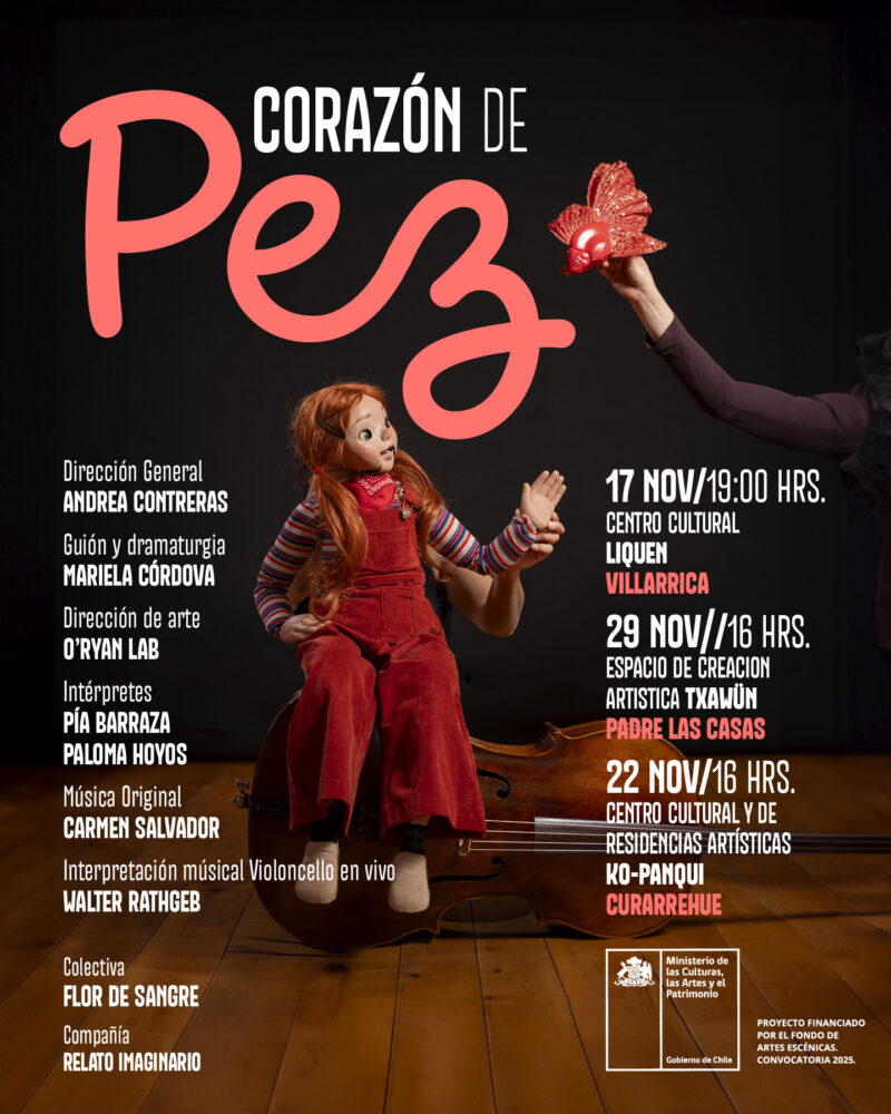 CULTURA.- La colectiva Flor de Sangre, de Pucón, en colaboración con la compañía Relato Imaginario, presenta su nuevo montaje teatral “Corazón de pez”, una propuesta escénica que marca el inicio de una circulación por cuatro comunas de la Región de La Araucanía. El estreno se realizará el lunes 17 de noviembre en el Centro Cultural Liquen de Villarrica, dando inicio a una itinerancia que visitará Curarrehue, Temuco y Padre Las Casas.