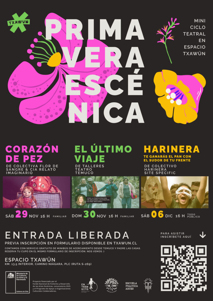 El domingo 30 de noviembre (16 hrs.) llega la obra “El último viaje” junto a Talleres teatro temuco y la destacada actriz nacional Solange Lackington. El sábado 6 de diciembre (16 hrs.) estará la obra “Harinera, te ganarás el pan con el sudor de tu frente” a cargo de Colectiva Harinera. Para asistir solo debes inscribirte en www.txawun.cl o en @espaciotxawun, la entrada es liberada y hay buses de acercamiento, ida y vuelta, desde Temuco y Padre Las Casas. Reserva tu asiento en el mismo formulario, cupos limitados.