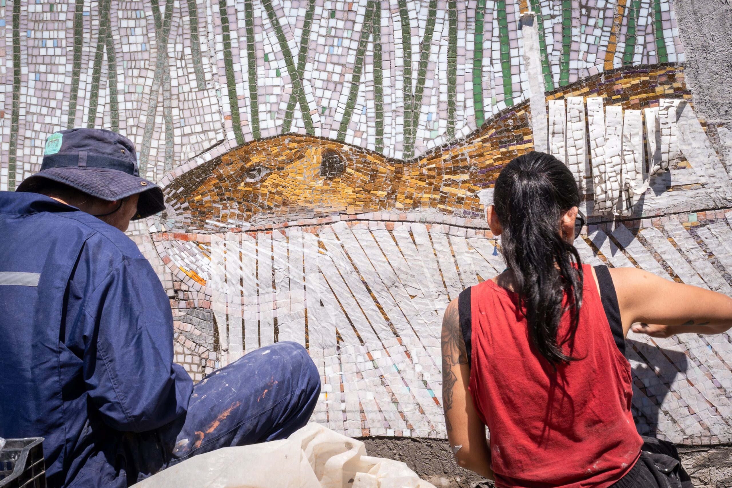 Con todos los materiales reunidos —dibujos, notas, fotografías y registros— las artistas elaboraron los bosquejos finales y dieron inicio a la confección del mural. El proceso de armado y pegado de las piezas se extendió por cinco meses, ensamblando fragmentos de vidrio de colores como un rompecabezas que dio forma a la escena del Mallolafken, Lago Villarrica. Durante este proceso se incorporaron nuevas especies observadas en otoño, como el coipo, integrado al mural como gesto de memoria y cuidado.