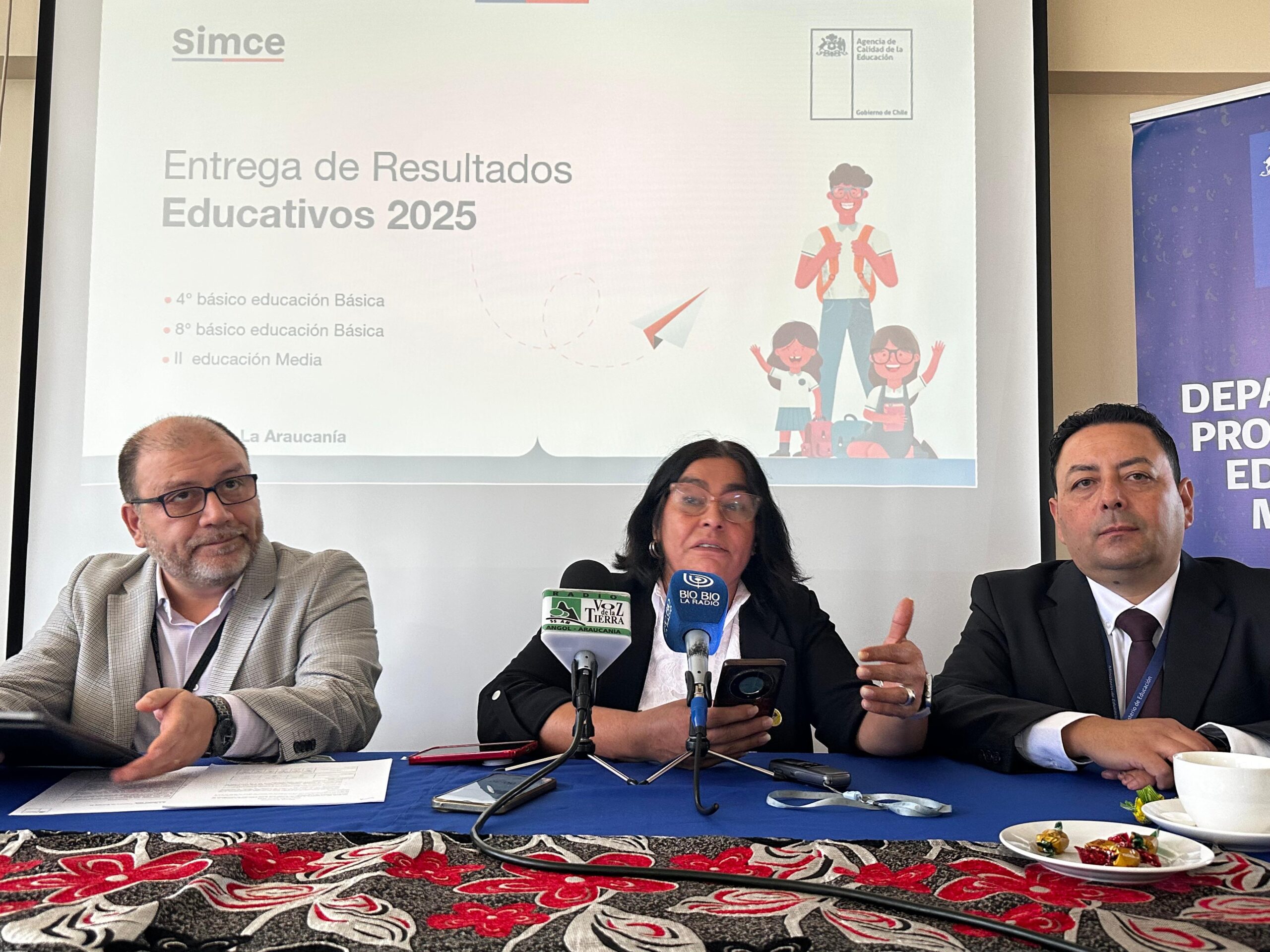 La seremi de Educación, Marcela Castro Armijo, junto al vocero Agencia de Calidad de la Educación Macrozona Sur, Cristian Córdova, dieron a conocer hoy los Resultados Educativos Simce 2025 para La Araucanía, correspondientes a las evaluaciones de Matemática y Lectura en los niveles de 4° y 8° básico, y II medio.