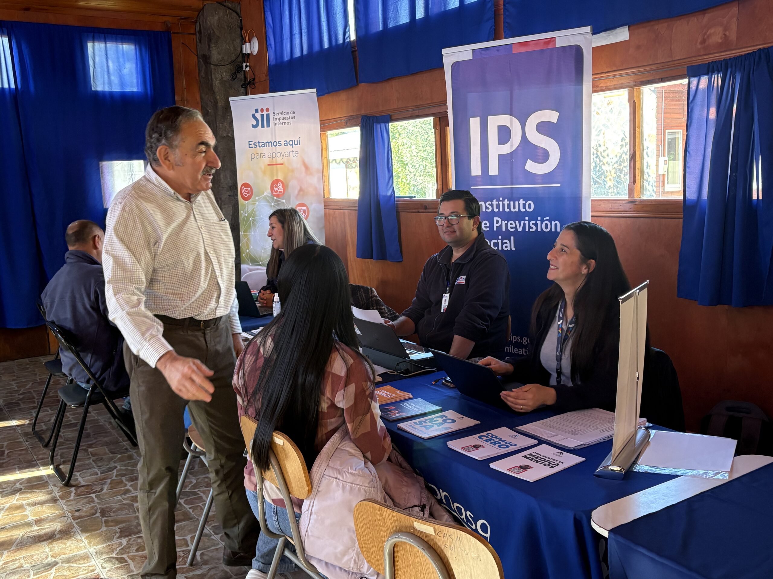 La Casa de la Cultura de la comuna cordillerana fue la sede escogida para instalar stands de instituciones públicas: ChileAtiende, Servicio de Impuestos Internos (SII), Servicio de Vivienda y Urbanización (Serviu), Dirección de Obras Hidráulicas (DOH) del Ministerio de Obras Públicas, Servicio de Cooperación Técnica (Sercotec), Servicio Agrícola Ganadero (SAG), Instituto Nacional de Desarrollo Agropecuario (Indap) y la Corporación de Asistencia Judicial (CAJ). Todas ellas dedicaron más de dos horas de atención para informar y ayudar en sus trámites a más de 50 usuarias y usuarios que se acercaron al llamado, ahorrándose con ello más de 150 kilómetros de viaje para efectuar sus trámites que regularmente realizan en Angol o Temuco.